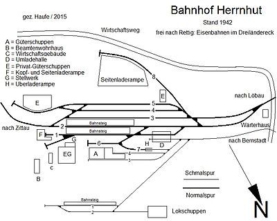 Zur Eröffnung der Bahnstrecke Zittau–Löbau existierten im Bahnhof Herrnhut ein kleines Empfangsgebäude mit einer Bahnhofswirtschaft, eine Kopf- und Seitenladerampe sowie zwei Kreuzungsgleise. Das Empfangsgebäude konnte zu der Zeit noch nicht als repräsentativ bezeichnet werden. Erst 1866 erhielt der Bahnhof das zweieinhalbgeschossige Empfangsgebäude mit eineinhalbetagigen Anbau. Das bisherige Empfangsgebäude wurde von der Bahngesellschaft zu einem Beamtenwohnheim umfunktioniert. Zu einer großen Erweiterung kam es im Bahnhof 1893 mit der Eröffnung der Schmalspurbahn Herrnhut–Bernstadt. Zu der Zeit hatte der Bahnhof auf der Normalspurseite die sechs Normalspurgleise südlich des Empfangsgebäudes und die drei Schmalspurgleise nördlich des Empfangsgebäudes. Der Bahnhof erhielt anders als andere Schmalspurbahnen nie eine Spurwechseleinrichtung. Alle Güter mussten in der am Gleis 1 zur Löbauer Seite hin gelegenen Umladehalle umgeladen werden.