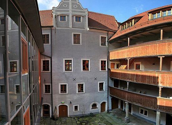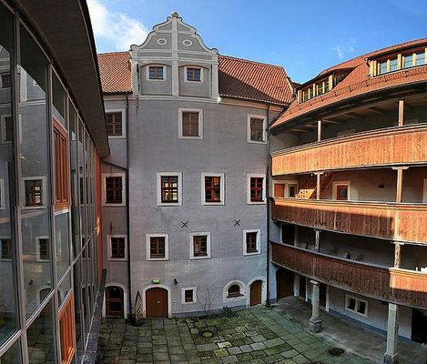 Durch aufwendige Renovierung wurde das alte Bürgerhaus, in welchem sich heute die Stadtbibliothek Pirna befindet, vor dem Zerfall gerettet und durch seine neue Nutzung der Öffentlichkeit zugänglich gemacht. Die Geschichte des Gebäudes in der Pirnaer Altstadt reicht bis zur Gründung der Stadt um das Jahr 1200 zurück und ist eng verbunden mit der des benachbarten Dominikaner-Klosters. Aus mündlichen Überlieferungen geht hervor, dass es sich bei dem nördlichen Teil des Hauses, um das Haus des Klosterabtes gehandelt hat. Inwieweit das Gebäude zum Kloster gehörte und zu welchem Zweck es gedient hat, konnte bis heute nicht eindeutig geklärt werden. Nach Auswertungen der Forschungen nimmt man an, dass in der Phase des Entstehens der ersten massiven Häuser nach Gründung der Stadt, auf der Dohnaischen Gasse zwei nebeneinander liegende Parzellen bebaut waren und die beiden „Kernbauten“ für das später entstehende große Anwesen darstellten. Im Laufe der nachfolgenden Epochen wurde dem Haus immer mehr zugefügt, so dass die beiden einzeln stehenden „Kernbauten“ später miteinander verbunden waren. Aus den frühen Zeiten des Anfangs sind noch der heutige Keller, der Gotische Saal und Teile des Obergeschosses erhalten. Der Gotische Saal bietet einen würdigen Rahmen für Veranstaltungen jeglicher Art und steht auch zur privaten Vermietung zur Verfügung. Besonders charakteristisch für diesen Raum ist die reich bemalte Holzbalkendecke aus der Zeit kurz nach 1470. Sehr sehenswert sind auch die bemalten Holzbalkendecken im 1. Obergeschoss, dessen Motive sich auch vereinzelt auf den Wänden wieder finden. Mit ein bisschen Phantasie kann man sich so die Pracht der Räume im späten 17. Jahrhundert vorstellen. Von der alten Küche des Hauses sind nur noch Reste des Rauchabzuges, der so genannten „Schwarzküche“ im heutigen Treppenhaus sichtbar.