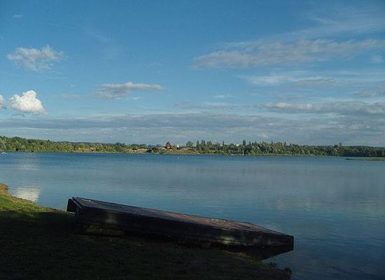 Er ist etwa 20 Kilometer von Dresden entfernt und befindet sich zwischen den Pirnaer Ortsteilen Birkwitz im Nordwesten und Pratzschwitz im Südwesten. Der See ist etwa 900 Meter lang und 950 Meter breit. In ihm befinden sich zwei kleine Inseln. Der westliche Teil wird als Badesee genutzt und ist Privatgelände. Betreiber und Eigentümer ist eine Gesellschaft bürgerlichen Rechts. Im Juli findet jeweils ein Strandfest statt.