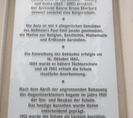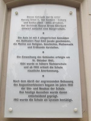 Die Schule wurde am Ende der Jüdenstraße an der Stelle des einstmaligen Sundhäuser Walls ab 1862 als eines der ersten nur für Schulzwecke erbauten Gebäude der Stadt nach Plänen des Gothaer Baurats Bruno Eberhard errichtet und 1865 bezogen. Die Schule war für 1000 Schüler ausgelegt. Gestalterischer Glanzpunkt der Schule war die Aula mit Deckengemälden sowie mit Büsten von Goethe, Schiller, Luther, Petermann und Gothaer Fürsten, außerdem mit allegorischen Wandgemälden, die der Gothaer Hofmaler Paul Emil Jacobs entworfen hatte und die größtenteils erst nach seinem Tod von Ludwig Bohnstedt ausgeführt wurden.