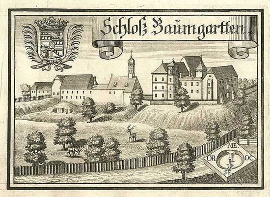 Die Edlen von Baumgarten waren seit dem 12. Jahrhundert im Besitz eines Gebietes, das später der Hofmark Baumgarten entsprochen hat. 1323 übergab Alram, der letzte der Baumgarten, sein Haus mit Leuten und Gut an seine Oheime die Grafen Alram und Albrecht von Hals; die Grafen übereigneten ihm dafür ihr Haus in Haidenburg. 1375 setzen sich die Landgrafen von Leuchtenberg in den Besitz der Grafen von Hals und demgemäß auch den der Baumgartens. Allerdings bestand ein jahrelanger Streit zwischen diesen und Agnes, Gräfin zu Ortenburg, die als Tochter des Grafen Alram von Hals ebenfalls Ansprüche auf den Nachlass äußerte. Am 26. Mai 1379 kam zwischen den Grafen von Ortenburg und dem Landgrafen von Leuchtenberg unter Vermittlung von Herzog Friedrich von Bayern ein Vertrag über das Hals’sche Erbe zustande. Die streitenden Parteien sollten die Hälfte der Herrschaften Leonsberg, Gangkofen und Baumgarten bekommen. Am 30. November 1379 verzichtete Johann Landgraf von Leuchtenberg und Graf zu Hals gegenüber Graf Heinrich IV. zu Ortenburg, dessen Gemahlin Agnes und deren Söhnen Alram I. und Georg I. durch einen Verkauf auf diese Güter .