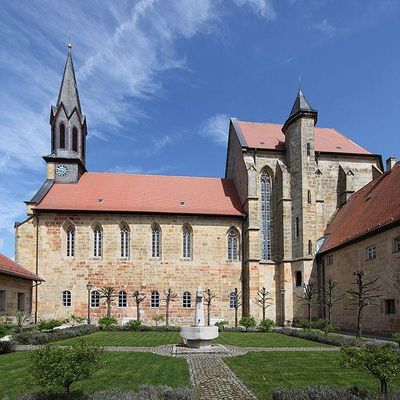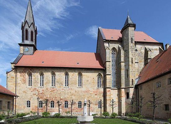 Ein Brand um 1286/1287 zerstörte den Gründungsbau des Zisterzienserklosters im etwa fünf Kilometer entfernten Ebersdorf. Der Wiederaufbau des Klosters erfolgte in der Nähe des benachbarten Dorfes Hofstädten in einer Talaue am Biberbach, einem rechten Zufluss des Mains. Das niedrige Langhaus ist wohl zuerst bereits um 1300 errichtet worden. Nach dessen Fertigstellung folgte mit einer zeitlichen Unterbrechung, wie eine Baunaht in der Fassade belegt, ab etwa 1327 der Bau des Hochchors der bis 1349 dauerte. An den Arbeiten war der Steinmetz Heinrich beteiligt. Das Gotteshaus wurde der Jungfrau Maria geweiht. Ein Brand zerstörte 1380 das Langhaus und den Kreuzgang. Die Hussitenkriege Mitte des 15. Jahrhunderts hatten Plünderungen und Brandschatzungen zur Folge.