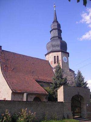 Die Saalkirche wurde 1766 unter Verwendung verschiedener Teile des Vorgängerbaus errichtet. Sie hat einen eingezogenen Chorturm, der bereits 1708 bis 1710 entstand. Nach einem Brand wurde der Aufbau des Kirchturms geändert. Er erhielt einen achtseitigen Aufsatz, den eine geschweifte schiefergedeckte Haube bedeckt. Ferner wurde der Innenraum neu gestaltet. 1766 gab der Kirchenmaler Johann Peter Weber aus Blankenhain der Kirche die künstlerische Ausgestaltung.