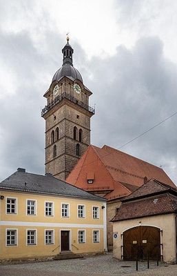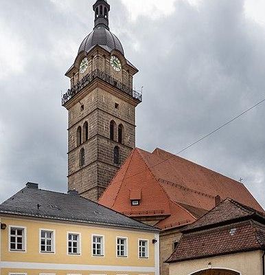 Die Kirche war bis ins 17. Jahrhundert von einem Friedhof umgeben und bildet einen unverwechselbaren Ostabschluss des Straßenmarktes. Infolge der Marktverlegung des Klosters Michelfeld wurde eine Kirche zunächst aus Holz, im 14. Jahrhundert dann aus Stein erbaut. Bei den Hussitenkriegen im Jahr 1430 wurde die Kirche schwer beschädigt und daher weitgehend neu erbaut. In den Jahren 1555 wurden Turm und Haube erhöht. In den Jahren 1685–1686 wurde das Langhaus durch den Maurermeister Johann Kirchberger nach Plänen Georg Dientzenhofers umgebaut und erweitert, wobei die gotischen Außenmauern des Langhauses und des Turms wieder verwendet wurden. Im Jahr 1730 wurde die Annakapelle als Stiftung des Pfarrers Friedrich Trettenbach an die Nordseite des Langhauses angebaut. 1755 wurde die Orgelempore verändert. In den Jahren 1779–1781 wurde der Chor durch Thomas Sebastian Preysinger neu erbaut und eine Sakristei angefügt. Das Chorgewölbe wurde 1794 ausgebessert. Nach einem Brand 1868 wurde der Turm 1886 wiederaufgebaut. Renovierungen wurden um 1900, 1939/1940 und 1976–1979 durchgeführt.