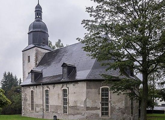 Der Grundstein für die Saalkirche wurde am 16. Mai 1738 gelegt. 1743 wurde der Bau fertiggestellt, eingeweiht aber erst 1760. Das mit einem schiefergedeckten Satteldach bedeckte Langhaus hat einen dreiseitigen Abschluss im Osten, im Westen steht der Turm, auf dem eine achtseitige Haube sitzt, die von einer offenen Laterne mit Turmkugel bekrönt ist. Die Glocke befindet sich in dem frei stehenden Glockenturm.