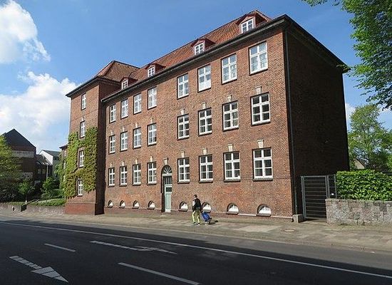 Schon in dänischer Herrschaftszeit diente der Stadtbezirk Duburg als eine administrative Enklave und entwickelte sich anschließend zum Sitz von Behörden. Das Finanzamt Flensburg wurde dort nach dem Ersten Weltkrieg vom Reichsbauamt Flensburg nach Plänen des Architekten Wilhelm Penners errichtet, der im Laufe seines Lebens des Weiteren in Aachen, Cuxhaven, Kiel, Königsberg und Hannover wirkte. Penner errichtete das Finanzamt als mehrflügelige Backsteingebäude, in barockisierenden Formen des Heimatschutzstils. Das Finanzamt fand seinen Platz auf dem Gelände eines ehemaligen Garnisonslazarettes, in Nachbarschaft der damals noch existierenden Duburg-Kaserne. Besagte Kaserne wurde erst 1990 abgebrochen und durch ein neues lokale Arbeitsamtsgebäude ersetzt. Das Finanzamt erhielt damit eine besondere städtebaulich Position zugewiesen. Das Finanzamt trägt die Adresse Duburger Straße 58–64, liegt aber zugleich am oberen Ende des Burgplatzes den es nach Nordwesten abschließt. In der Sichtachse des Burplatzes befindet sich der Vorhof des Finanzamtsgebäudes. Eine Freitreppe führt zum Haupteingang über dem die Steinrelieftafel mit der Inschrift „Finanzamt“ hängt. Im Mittelbau befand sich ursprünglich das eigentliche Finanzamt, im Nordflügel befanden sich Zolldienststellen und das Reichsbauamt. Dienstwohnungen befanden sich im Südflügel und im Straßentrakt, was baulich anhand der dortigen Balkone gut erkennbar ist. Das Gebäude wird nach oben durch niedrige Walmdächer abgeschlossen.