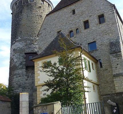Die Burg wurde 1215/30 von Markgraf Hermann V. von Baden erbaut und 1312 erwähnt. Erhalten sind das Burghaus Steinhaus, der ehemalige Palas der Burg mit romanischem Kamin und Aborterker sowie der runde mit Buckelquader gemauerte 36 m hohe Bergfried, der nach dem Turmwärter Schoch benannte Schochenturm . Im 16. Jahrhundert wurde eine Wärterwohnung eingerichtet. Das Burghaus ist über den Bogen des Stadttors mit dem Turm verbunden.