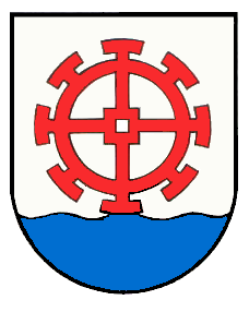 Beschreibung: „In Silber über einem gewellten blauen Schildfuß ein [vierspeichiges, achtschaufliges] rotes Mühlenrad.“