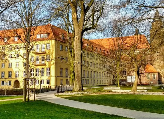 Das ehemalige Stadtschloss Coesfeld fügt sich mit seiner historischen Fassade harmonisch in das Bild der gleichnamigen Kreisstadt. Der angrenzende gepflegte Schlossgarten mit renaturierter Berkel und liebevoll gestalteten Parkanlagen prägt den kulturellen Kern der Stadt und macht ihn zu einem unverwechselbaren Gut des westlichen Münsterlandes.