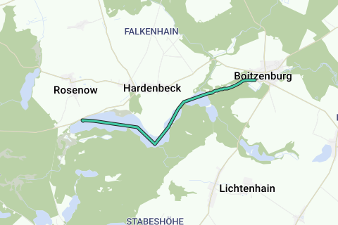 Start: Gestartet wird auf dem Küchenteich vom Schloss Boitzenburg, weiter führt die Fahrt durch einen dichten Kanal durch den Fasanengarten und Carolinenhain bis auf den Schumellensee. Hier lohnt ein Stopp an der schönen Naturbadestelle mit Steg und großer Liegewiese. Durch ein dichtes Labyrinth führt der Wasserweg auf den großen Haussee vorbei an dem Ort Hardenbeck (auch mit schöne Badestelle inklusive Sprungturm) bis ganz ans Ende des langgeszogenen Sees zur Rosenower Badestelle in Höhe der Lychener Chaussee.