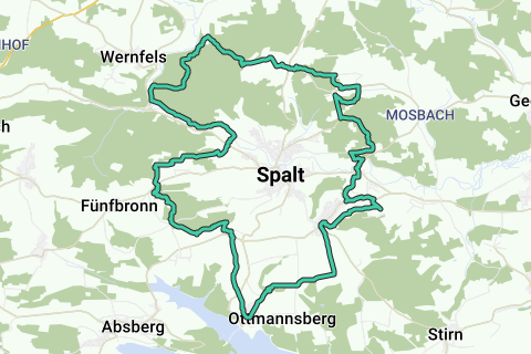 Über Berge und Täler erkunden Sie Spalt. Es wäre kein übertriebener Luxus, wenn Sie mal an einem Straßencafé entlang dieser Route halten. Es wird schneidig! Diese Route kann ab und zu holprig sein. Ein Teil der Route ist unbefestigt. Genießen im Quadrat!