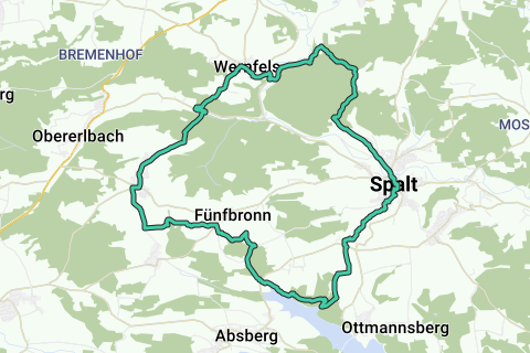 Es wäre kein übertriebener Luxus, wenn Sie mal an einem Straßencafé entlang dieser Route halten. Es wird schneidig! Über Berge und Täler erkunden Sie Spalt. Wenig Chancen, dass Sie entlang dieser Route viel Autos sehen. Diese Route führt entlang einiger unbefestigten Wege. Wer gerne sinnen oder "verweilen" möchtet: halten Sie mal an der Kirche (Rieterkirche St. Marien und Christophorus). Sie können diese Route überall starten. Das Kloster (St. Emmeram) ist aber bestimmt ein guter Startpunkt (und Ruhepunkt). Wenn die Wettergötter gut gelaunt sind, ist dies eine schöne Tour. Eine Route wobei Sie sich sicher nicht langweilen.