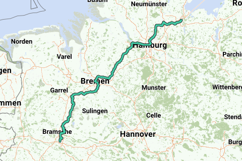 Pilgerweg zum Wandern zwischen Lübeck und Osnabrück. Folgende Städte liegen auf der Route: Lübeck, Hamburg, Bremen, Vechta und Osnabrück.