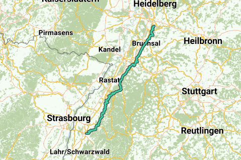 Rennradversion einer Pilgerroute für Wanderungen zwischen Malsch und Offenburg. Folgende Städte liegen auf der Route: Malsch, Bruchsal, Ettlingen, Baden-Baden, Oberkirch, Durbach und Offenburg