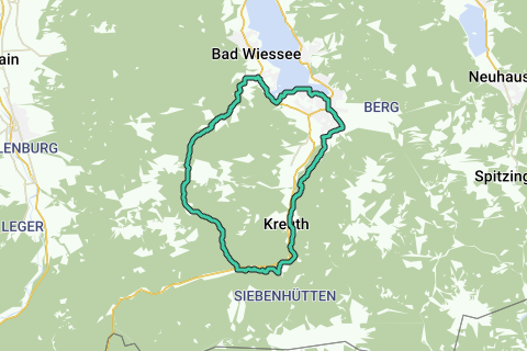 Parkplatz an der Strandhütte Ringsee in Rottach-Egern, Ringsee, Söllbachtalstraße, entlang des Söllbachs, Söllbachau-Alm, Gurnbach-Holzerstube, sehr steiler Anstieg (1km) hoch zur Schwarzentenn-Alm, Winterstube, B307 kreuzen, Wildbad-Kreuth, Rainer Alm, Riedlern, Weißachalm, Weißachaustraße, Trinis, Rottach-Egern, Egern, am See entlang zum Parkplatz zurück.