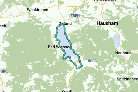 Vom Parkplatz Salitererstraße kurz über die Südliche Hauptstrasse (B307) bis zur Ludwig-Thoma-Straße, dort links hinein. Rechts in den Anzengruberweg. Links i.d. Sonnenmoosstraße (Blick auf den Wallberg). Rechts i.d. Glaslstraße. Links i.d. Karl-Theodor-Straße. Rechts i.d. Kapellenweg. Rechts i.d. Weißachaustraße.Links über die Weißachbrücke und sofort rechts i.d. Braubichlweg. Den Dammweg entlang der Weißach folgen (enger Leinpfad) bis zum Ringbergweg. Rechts über die Brücke und sofort links über den Weißachdamm bis zur Lärchenstraße.Hier rechts bis zur Aribostraße dann links und wieder rechts i.d. Kobellstraße bis zur Ganghoferstraße am See. Hier scharf links am See entlang.