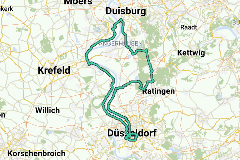 Diese 82 km lange Rennradroute startet in der Nähe des Düsseldorfer Bahnhofs. Sie radeln durch eine abwechslungsreiche Landschaft, durch Wälder, Felder und entlang des Rheins bis in die Nähe von Duisburg. Unterwegs kommen Sie an genügend Orten vorbei, um etwas zu trinken, zu essen oder einfach eine Pause einzulegen.