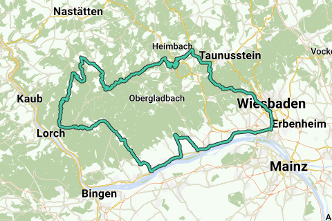 Entlang dieser Motorradroute erwartet Sie eine abwechslungsreiche Landschaft mit malerischen Tälern, weiten Wäldern und wunderschönen Weinbergen. Die Strecke hat eine Gesamtlänge von 108 km. Es beginnt und endet in Wiesbaden.