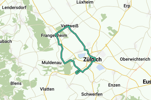 Kennen Sie die Region rund Vettweiß schon? Mit dieser Route fahren Sie bestimmt an neuen Orten vorbei. Auf Erkundung in Burg Juntersdorf werden Sie verschiedene lustigen Radwege vorbeikommen. Einfach genießen! Bestimmt mal halten an Kurkölnische Landesburg Zülpich. Die Fahrradroute beginnt am Parkplatz.