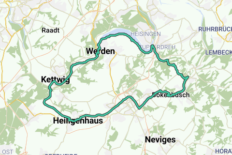 Einige schönen Radwege und -Pfade in Heiligenhaus. Geringe Emission für denjenigen, der den öffentlichen Verkehr mit erholsamem Radfahren kombiniert. Die Fahrradroute beginnt am Parkplatz. Diese Route kann man mit demöffentlichen Verkehr kombinieren. (Bahnhof Alter Bahnhof Kupferdreh). Diese Route führt entlang des Schattens eines Schlosses (Schloss Oefte).