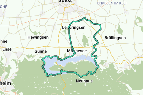 Eine schöne Schleife durch Möhnesee. Hotel Haus Delecke liegt entlang dieser E-Bike-Route. Achten Sie auf Wanderer entlang dieser Route. Die Fahrradroute beginnt am Parkplatz.