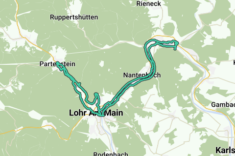 Wärmen Sie die Beine auf und genießen Sie die Landschaft in Lohr am Main. Diese Route führt entlang des Schattens eines Schlosses (Schloss Steinbach). Diese Fahrradroute fällt teilweise mit dem Netzwerk der GR-Wanderstrecken zusammen. Die Fahrradroute beginnt am Parkplatz.