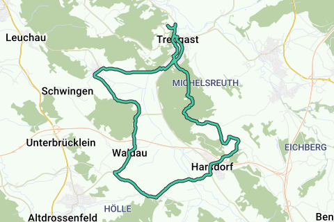 Entdecken Sie die Region entlang unbefestigter Wege. Diese Route ist für alle Jahreszeiten geeignet. Das Wasser von Trebgast (und auch die Landschaft) sieht immer anders aus. Die Fahrradroute beginnt am Parkplatz. Eine Sehenswürdigkeit entlang dieser Route müssen Sie auf jeden Fall gesehen haben: TSV Trebgast.