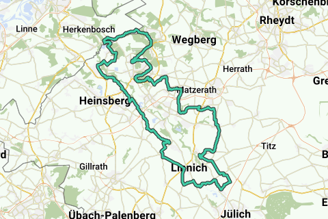 Dann folgen Sie über Straßen ohne Radweg in die Stadt Linnich. Von dort aus folgen Sie wieder den Straßen. Bei Welz geht es abseits des Merzbachtales bergauf. Und dann geht es für kurze Zeit steil hinab ins Roertal bei Floßdorf.