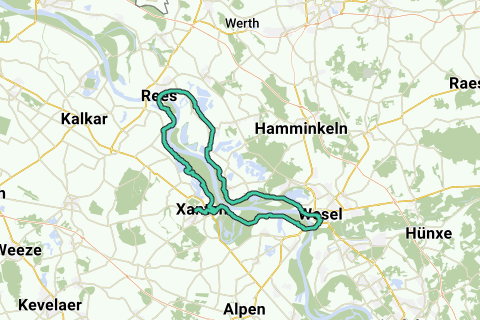 Nord und Südroute mit Fähre Rees 57km: Bhf. Xanten, Bislicher Insel, Werrich, Ginderich, Rheinbrücke Wesel, Lippemündung, Zitadelle, Rheinpromenade, Bislich, Haffen, Bergwicks, Rees, Fähre Rees, Oberdorf, Obermörmter, Wardt, Lüttingen, Bhf. Xanten.