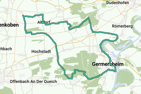 Von Am Sportplatz, 67489 Kirrweiler, Duttweiler, Altdorf, Böbingen, Gommersheim, Schwegenheim, Mechtersheim (SunSeeBar), Lingenfeld, Germersheim (Elio Eis), Bellheim, Zeiskam (Zeiskamer Mühle), Großfischlingen, Venningen, Kirrweiler.