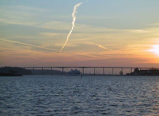 Svendborgsundbroen ist eine Brücke bei der Stadt Svendborg im Süden der dänischen Insel Fyn , die über den Svendborgsund zum Ort Vindeby auf der kleinen Insel Tåsinge führt. Die 1966 fertiggestellte Brücke war das letzte Glied, das Fünen über Siøsundbroen und Langelandsbroen mit der Insel Langeland verbindet. Über die zweispurige Straßenbrücke führt die Fernstraße Primærrute 9, die dort täglich von 15.700 Fahrzeugen befahren wird .