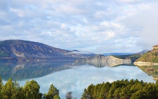 Die Yesa-Talsperre staut den Fluss Aragón in den spanischen Vorpyrenäen zu einem bei Vollstau 2089 Hektar großen See auf.