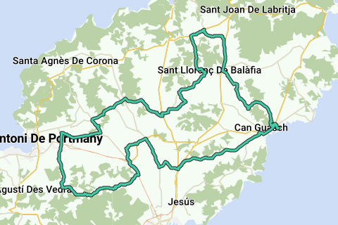 Diese 70 km lange Runde über Ibiza ist eine wunderschöne Kombination aus sportlicher Herausforderung und Entspannung. Du radelst durch das echte Ibiza: ländliche Ruhe, Hügel voller Kiefern und Mandelbäume, charmante Dörfer und Aussicht, die in Erinnerung bleibt.