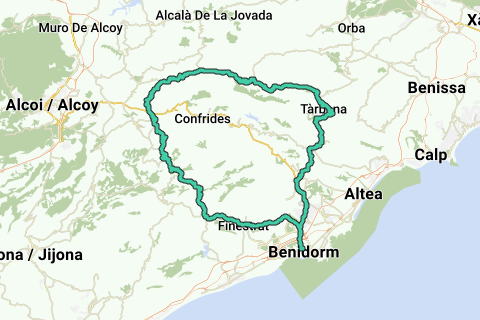 Über Puerto de Finestrat und Puerto de Tudons gelangst du ins Hinterland der Costa Blanca und fährst über sehr, sehr ruhige Straßen über Quatretondeta nach Castell de Castells. Die Straßen zwischen Benassau und Facheca sind sehr hügelig, aber du fährst durch eine wunderschöne Umgebung. Nach dem Passieren von Quatretondeta (in Richtung Facheca) kannst du von der Hauptstraße (Richtung Süden) die hohen nadelartigen Felsformationen (Els frares de Quatretondeta) sehen, die wie festgeklebt an dem Gebirge der Sierra de Serrella wirken. Nach dem Passieren von Castell de Castells fährst du über die Auffahrt des Collado de Bixauca zurück nach Benidorm.