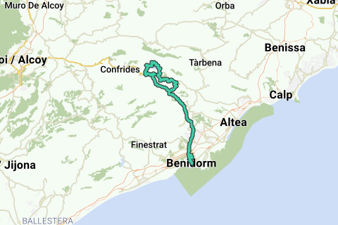 Nachdem du schließlich von der Staumauer hinaufgeklettert bist, steigst du ins Tal des Rio de Guadalest ab. Kurz bevor du den Fluss überquerst, biegst du rechts auf einen Nebenweg ab. Dieser Weg steigt über das Gehöft Gines zur CV-70 hinauf. Übrigens ist es ein steiler Anstieg: In 3,3 Kilometern überwindest du 300 Höhenmeter, was einem durchschnittlichen Steigungsgrad von 9 % entspricht! Was bleibt, ist dann der steile Abstieg vom Alto de Turron Duro und danach die belebten Straßen nach Benidorm.