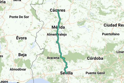Rennradvariante des Pilgerwanderwegs Saint-James Via de la Plata, der von Sevilla nach Cáceres führt und dabei Fuente de Cantos, Zafra und Mérida passiert. Dieser Weg ist Teil des Camino-Netzwerks, das nach Santiago de Compostela führt.