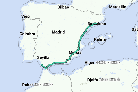 Vollständige Strecke der N-340 Straße, auch bekannt als die Carretera del Mediterraneo. Die N-340 ist die längste Autobahn der Iberischen Halbinsel mit einer Länge von ungefähr 1325 km. Sie verläuft von Barcelona nach Cádiz entlang der gesamten Mittelmeerküste, durchquert 4 autonome Gemeinschaften, 10 Provinzen und mehr als 150 Gemeinden. Die N-340 wurde in einigen Abschnitten verbreitert und in eine Autobahn umgewandelt, sodass wir sie manchmal nutzen müssen. Der Verlauf dieser Straße wird auch als alte "Via Augusta" bezeichnet, die während der römischen Besetzung der Iberischen Halbinsel erbaut wurde und die gesamte Mittelmeerküste von Gibraltar nach Barcelona verlief. Für viele ist es das spanische Pendant zur US Route 66. Wir müssen beachten, dass es eine Hauptverkehrsader ist, sodass wir mit viel Verkehr rechnen müssen: sowohl mit Lkw als auch mit Autos, daher müssen wir äußerste Vorsicht walten lassen.