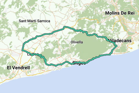 Dies ist eine Fahrt auf Expertenniveau mit einer Reihe von unglaublichen Ausblicken. Die Route beginnt entlang der Küste und verlässt Sitges in nordöstlicher Richtung, führt durch Castelldefels und biegt dann bei Gavà landeinwärts (und steil bergauf) ab. Es folgt ein steiler Anstieg von 8 km zum Coll de Begues. Von dort geht es die verbleibenden 75 km bis zum Meeresspiegel hinunter, aber nicht ohne einige sanfte Anstiege von 1 km bis 3 km, die die Beine schwächen. In der Nähe der Küste wirst du mit einer schönen Fahrt rund um den Stausee und den Damm von Foix verwöhnt, bevor du komplett zur Küste hinunterfährst.
