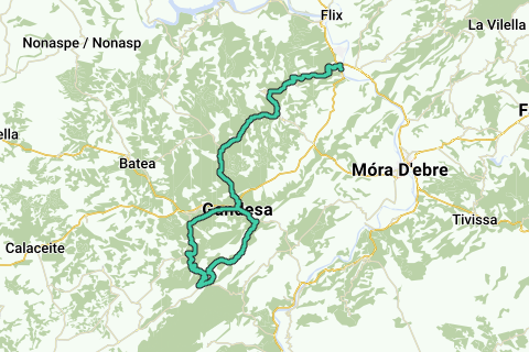 Dies ist eine mittelschwere bis schwierige flache Route, die in einem Weinland beginnt, zum bergigen Landschaft des Serra de Pandols-Cavalls ansteigt und sogar einen interessanten "Via Verda" (grüner Weg) umfasst - eine ehemalige Eisenbahnlinie, die in einen Rad- und Wanderweg umgebaut wurde. Diese Route steigt sofort nach dem Verlassen von Ascó nach La Fatarella an und belohnt die Radfahrer dann mit 30 km sanften, aber größtenteils abfallenden Landstraßen durch Weinberge und Ackerland. In Bot erklimmen wir über zahlreiche Haarnadelkurven die Berge und steigen dann bis zum Prat de Comte ab. Wir kehren zum Pandols-Cavalls-Gebirge zurück und steigen weiter ab, über die Via Verda de la Terra Alta, entlang des alten Bahnhofs und durch den Tunnel, bis zum ehemaligen Nonnenkloster, dem Heiligtum von Mare de Deu de la Fontcalda, und ihren Warmwasserquellen im Fluss. Ein schöner Ort, um Halt zu machen, wo auch in der Hochsaison ein Restaurant geöffnet ist. Um das Tal des Heiligtums wieder zu verlassen, geht es hinauf zur Coll d'en Torner, und bei Gandesa kehren wir auf demselben Weg nach Ascó zurück.