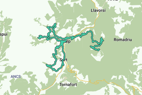 Dies ist eine Fahrt mittlerer Länge, für sehr fitte, erfahrene Radfahrer. Die Route beginnt in Sort und steigt über 20 km fast 1200 Meter hoch bis zum Skiberg bei Port Ainé, bevor sie abfällt und erneut direkt nach oben nach Llessuí steigt und über das Olp- und Envui-Plateau zurück nach Sort fährt. Es gibt 3 große Anstiege auf dieser Route und überall eine wunderschöne Aussicht auf die Pyrenäen.