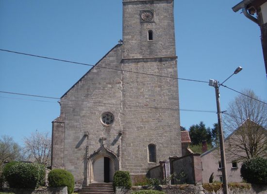Kirche im gothischen Stil. Erbaut im 15. und 16. Jahrhundert auf Überresten einer Kapelle aus dem 13. Jahrhundert. Der markante Glockenturm ist in einer Ecke der Kirche hochgezogen. Über dem Portal ist ein "dreigesichtiger" Kopf gearbeitet, Symbol für Vergangenheit, Gegenwart und Zukunft. Die modernen Kirchenfenster stammen aus den 1990er jahren und zeigen biblische Motive und solche aus der Geschichte des Dorfes.