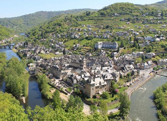 Entdecken Sie diese Stadt mit ihren zahlreichen mittelalterlichen Überresten, die uns ihre alten Gassen, Fachwerkhäuser, Cantous und Ganelles bietet, und natürlich können Sie die Bauwerke des Mittelalters bewundern: die beiden gotischen Brücken aus dem 13. Jahrhundert, das Schloss und die Fachwerkhäuser mit Erkern aus dem 15. und 16. Jahrhundert und vor allem das Panorama des Kalvarienbergs über der Confluence! (Anfahrt mit dem Bus/Auto, Richtung Aurillac).