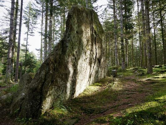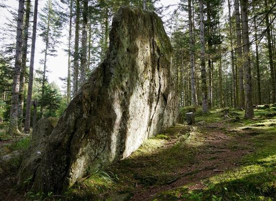Der Pierre Kerlinquin ist ein riesiger, gravierter monolithischer Block aus rotem Sandstein, der fast 5 Meter hoch, 8 Meter lang und etwa 1,5 Meter breit ist. Er scheint von einer Sandsteinklippe abgerissen worden zu sein, als der Gletscher, der die Anhöhen bedeckte, ihn mehrere hundert Meter weit transportierte. Versammlungsort für rituelle Praktiken, die auch in der Neuzeit noch üblich waren. Sein Gewicht wurde auf etwa 132 Tonnen geschätzt. Wurde 1886 zum historischen Monument erklärt.
