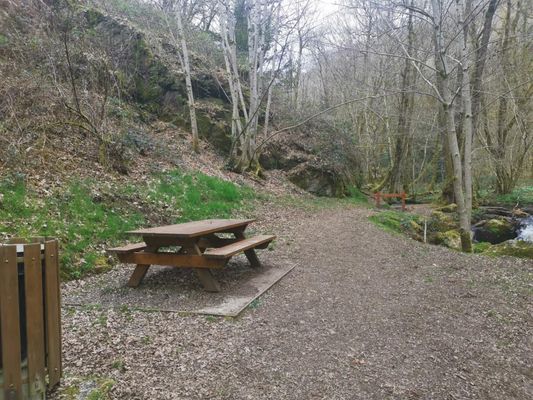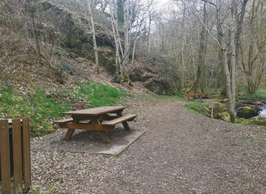 Mehrere Picknicktische, die in der Allée du Verger entlang des Bachs aufgestellt wurden.