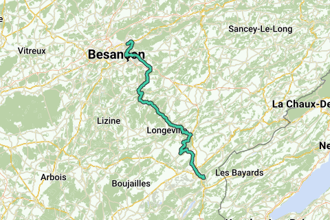 Von dem Campingplatz in Besançon folgt man ein paar Kilometer der Doubs über den Radweg EV6 (Euro vélo). Danach geht es wieder bergauf zu den Orten Montfaucon und Saone.