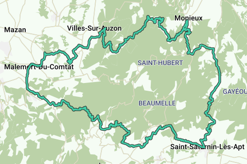 Fahrradroute, die in Venasque beginnt und dir sofort die schwerste Seite des Col de Murs präsentiert. Wir fahren hinunter ins Dorf Murs und radeln weiter nach Saint Saturin les Apt. Hier erklimmen wir den Col de la Liguière. Eine schöne, nicht zu unterschätzende Steigung von 10 km. Vom Gipfel radeln wir ins Dorf Monieux. Und von hier aus fahren wir 20 km durch die wunderschöne Schlucht. Gorges de la Nesque. Hier kann man die herrliche Natur und die Ausblicke genießen.