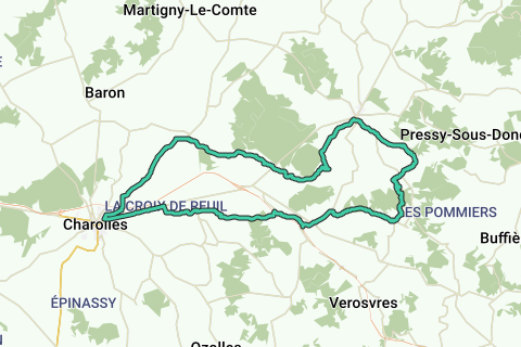 Schöner, kreisförmiger Radweg ab dem Camping Municipal in Charolles. Man fährt über sehr ruhige, befestigte Wege durch eine schöne und abwechslungsreiche Landschaft. Nur die letzten 2,5 km verlaufen über eine etwas belebtere Straße. Die Länge beträgt 42 km mit 600 Höhenmetern.
