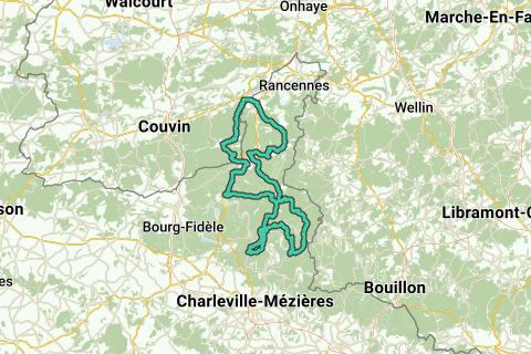 Kletterroute durch die französischen Ardennen mit Startpunkt in Fumay. Wir starten in Fumay und fahren über die Voie Verte entlang des Kanals zu unserem ersten Anstieg in Revin. Über 6 schöne Haarnadelkurven fahren wir den Mont Malgré Tout hinauf. Danach fahren wir nach Monthermé, um die Côte de la Roche aux Sept Villages zu erklimmen, 4 km mit 5 %. Nach der Abfahrt folgt sofort der Roc La Tour, ein schöner Anstieg entlang der Lyre durch den Wald, 3,4 km mit 7,9 %. Nach dieser Abfahrt müssen wir direkt wieder zum Col du Loup aufsteigen. Danach folgt die Côte de la Neuville-aux-Haies (Les-Hautes-Rivières). Wie die anderen Anstiege im Wald, 2 Haarnadelkurven. Danach fahren wir die Croix Gillet hinab und fahren den Pré des Rochettes hinauf, um schließlich über Belgien nach Fumay zurückzukehren. Eine schöne Kletterroute durch die Wälder der französischen Ardennen.
