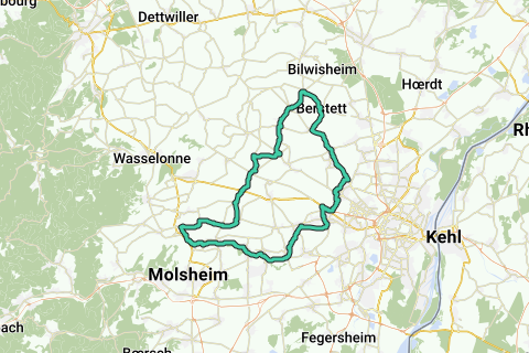 Vor den Toren Straßburgs verläuft die Straße zwischen Wolfisheim und Mittelhausbergen entlang des Festungsgürtels der elsässischen Metropole. Jenseits von Pfulgriesheim öffnet sich der Kochersberg, die "Kornkammer" des Elsass. Die großen Anbauflächen werden von runden Hügeln rhythmisch gegliedert. Ab Osthoffen-Dahlenheim weichen sie den Weinbergen, die sich an den Hängen der Mossig und an den Flanken des Mont Scharrach entlangziehen. Der Rückweg nach Wolfisheim führt entlang der Ufer der Mossig und des Bruche-Kanals.