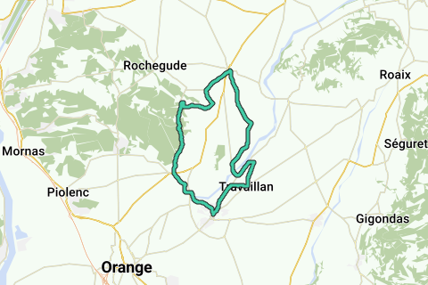 Route: Vom Friedhof in Richtung La Galle fahren, kurz nach dem Ortsschild rechts zur Kirche abbiegen. Dann nach links und an Tennisplätzen vorbeifahren bis zu einem Weg, der mit einem Drahtseil abgesperrt ist Hier rechts abbiegen und einem Weg folgen, der durch eine Furt und an einem Bach entlang führt, der oft ausgetrocknet ist. Man kommt auf eine Asphaltstraße, an der nächsten Kreuzung rechts fahren und ca. 600 m weiter auf einen Weg achten, der an einem einzelnen Steinpfeiler links in den Wald führt. Markierung rot/gelb (GRP, großer Rundwanderweg). (1: 73 m - 2 km) Auf diesem Weg bis zu einer Furt fahren. Hinüberfahren und einen Weg nach links einschlagen, der an einem Picknickplatz vorbei bis zu einer Kreuzung führt. Rechts bergauf der Markierung bis zum Gipfel des Bergkamms folgen. (2: 160 m - 6 km) Auf der anderen Hangseite bis zu einer Asphaltstraße fahren, hier rechts abbiegen. Auf dieser Straße bis zur Kreuzung mit der D74 fahren. Dann zunächst rechts und sofort wieder links auf eine kleine Straße abbiegen (unauffällige Gelb/Rot-Markierung auf einem Schild) (3: 97 m - 10 km). Auf dieser Straße weiterfahren, dann immer geradeaus auf einen Weg. Der Weg führt zur D11, hier rechts abbiegen und bis zum Ausgangspunkt zurück.Tour ausgearbeitet von CG84 und Vtopo - Auszug aus Vtopo Vaucluse http://vtopo.fr/vtt-vaucluse.html